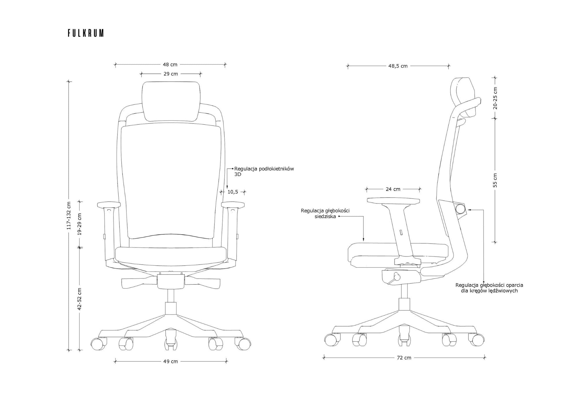 FULKRUM jest fotelem ergonomicznym, co oznacza, że zbudowany został tak, by doskonale podpierać ciało. Producent wykorzystał nowoczesne mechanizmy umożliwiające regulację wysokości siedziska oraz zagłówka, podłokietników 3D, głębokości siedziska czy oparcia dla kręgów lędźwiowych. Można także precyzyjnie odchylać fotel za sprawą samoważącego mechanizmu Synchron. Ergonomiczny fotel biurowy FULKRUM zapewnia też przewiewność i komfort termiczny za sprawą siatki SM, którą tapicerowane jest oparcie. Siedzisko i zagłówek mogą być tapicerowane tkaniną materiałową w osiemnastu kolorach lub skórą naturalną w trzech kolorach.