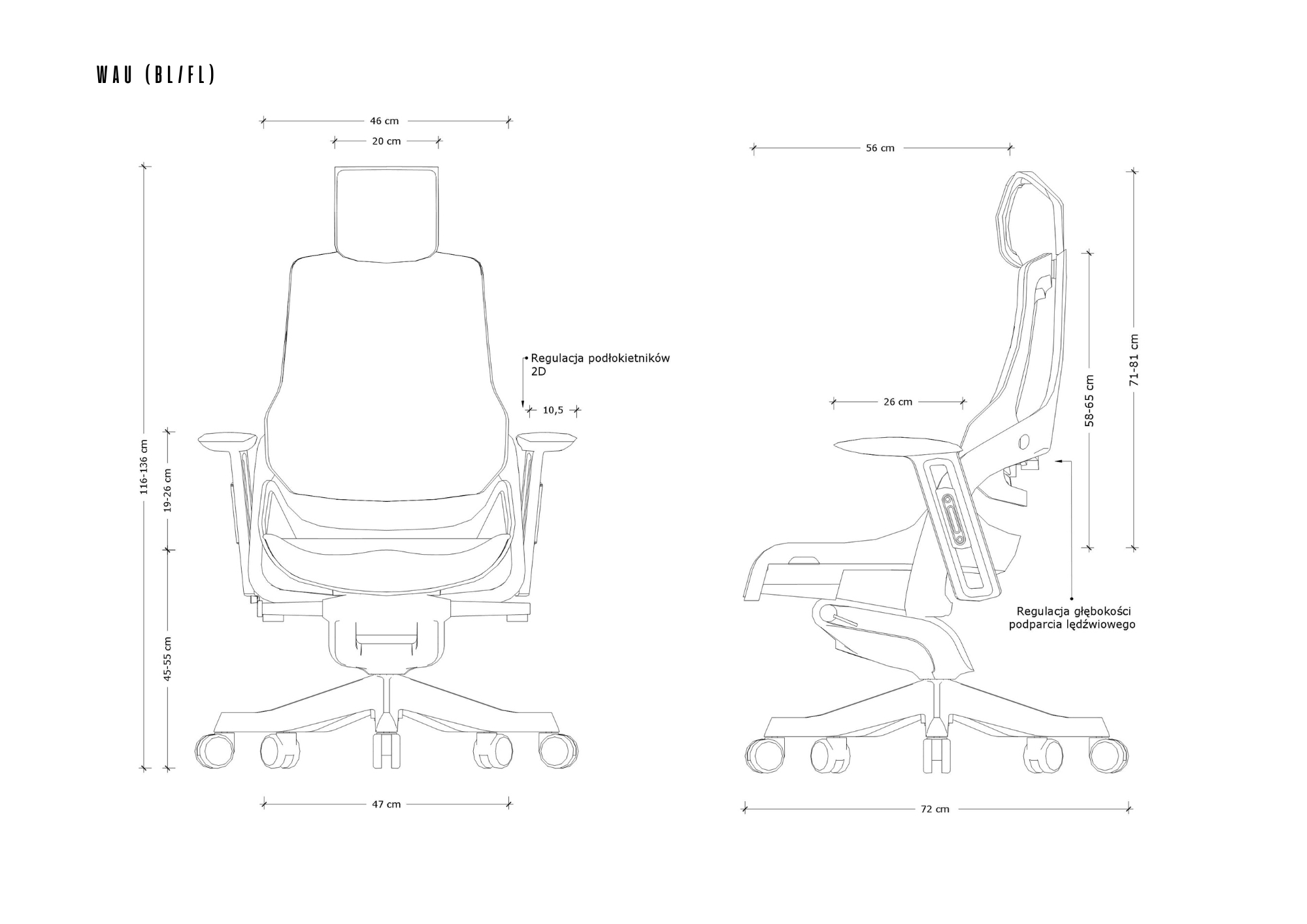 - Regulacja głębokości podparcia lędźwiowego